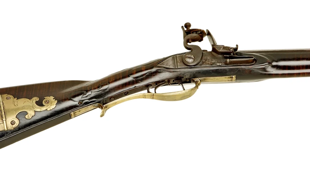 This rifle was a top-of-the-line model that appears to have been made in York County, Pennsylvania, of a type that falls between 1780 and 1800. This particular example was made in 1792. The German gun-makers centered in Lancaster and York, Pennsylvania, were the ones that started with the classic German jaeger rifle and developed and perfected the long rifle for the conditions in the New World. The final form was as much a work of art as a weapon featuring delicate lines, swamped barrels, relief carving and the lithe grace of a ballerina.